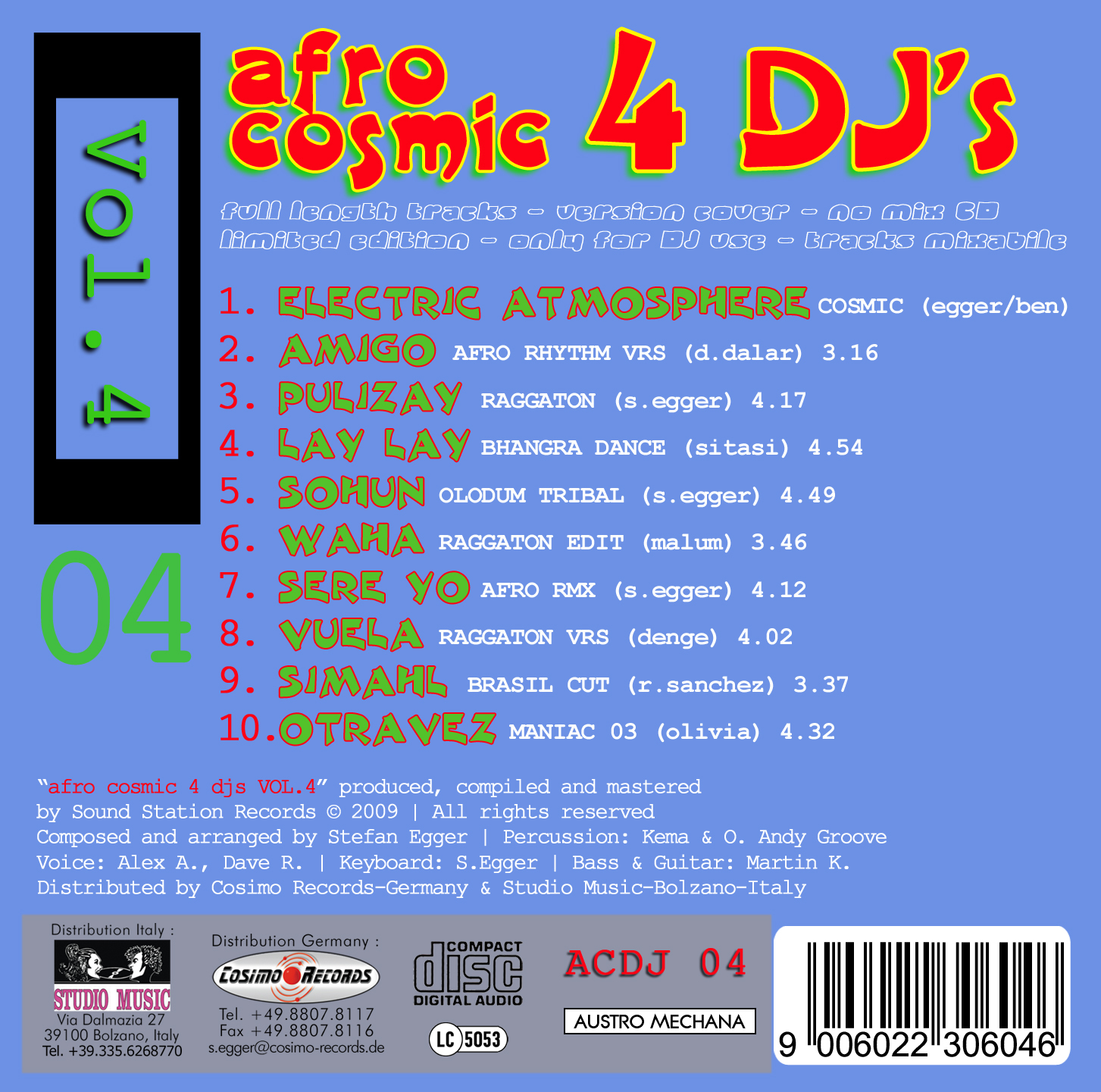 afro cosmic 4 DJs | vol. 4 €18,90 Includes 19% MwSt. plus shipping - afro cosmic 4 DJs | vol. 4 quantity + Add to cart Categories: Afro Cosmic 4 DJs, NO-MIX CD Related products Dj Stefan Egger | Cosmic Space Balls€18,90 Includes 19% MwSt. plus shippingAdd to cart afro cosmic 4 DJs | vol. 5€18,90 Includes 19% MwSt. plus shippingAdd to cart AP 00109 Cosmic Esmeralda MCD€18,90 Includes 19% MwSt. plus shippingAdd to cart Cosmic Evolution Vol. II : Dj Stefan Egger€18,90 Includes 19% MwSt. plus shippingAdd to cart